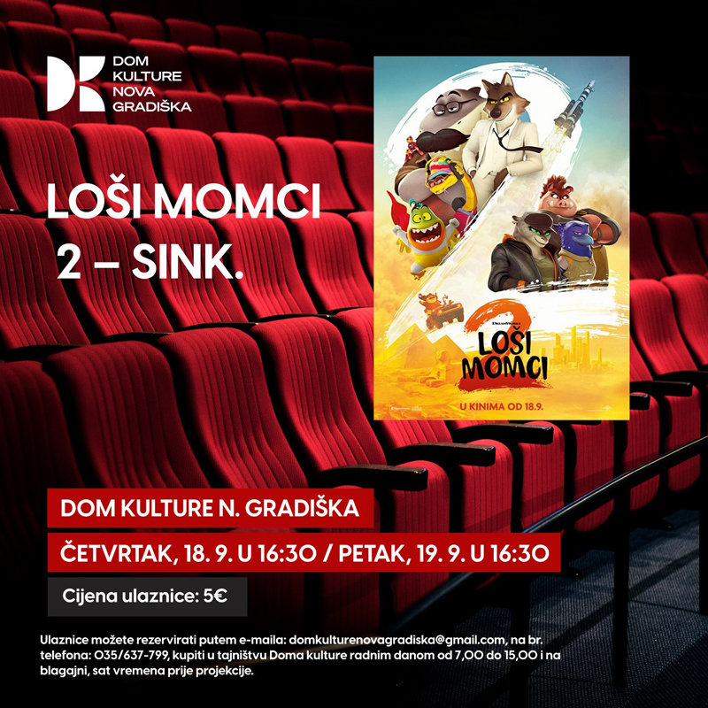 Ulaznice možete rezervirati putem e-maila: domkulturenovagradiska@gmail.com, na br. telefona: 035/637-799, kupiti u tajništvu Doma kulture radnim danom od 7,00 do 15,00 h i na blagajni, sat vremena prije projekcije.