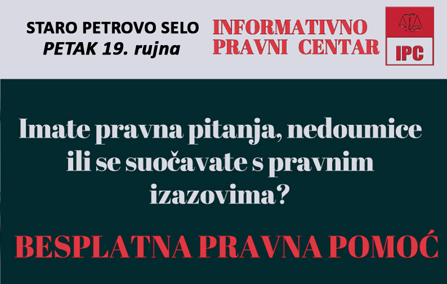 - Ovaj petak, 19. rujna 2025., građani mogu dobiti besplatnu pravnu pomoć u vijećnici Općine Staro Petrovo Selo na adresi Trg kralja Tomislava 2 od 9 do 13 sati.