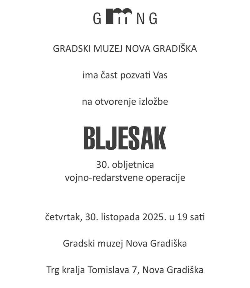 Gradski muzej Nova Gradiška poziva vas u četvrtak, 30. listopada, u 19 sati na otvorenje izložbe o vojno-redarstvenoj operaciji Bljesak.