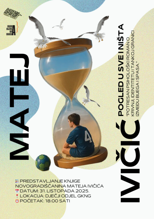 Gradska Knjižnica Nova Gradiška poziva Vas na promociju prve knjige našeg mladog zavičajnika Mateja Ivičića koja će se održati 31. listopada u 18 sati na Dječjem odjelu Gradske knjižnice Nova Gradiška. Matej će nam predstaviti svoj novi psihološki roman “Pogled u sve i ništa”.