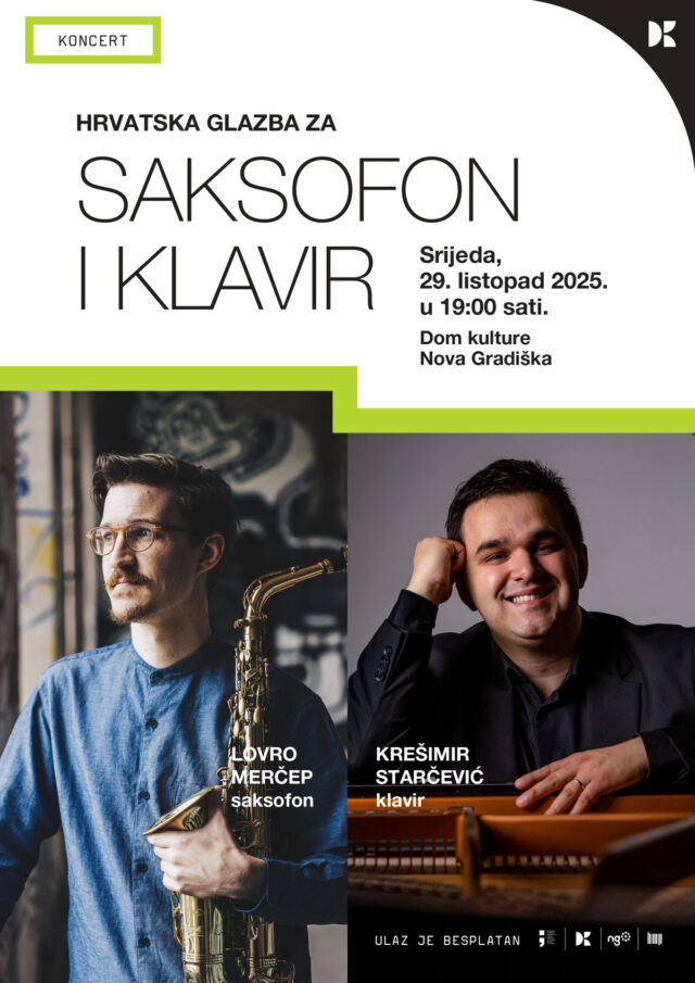 Poštovani obožavatelji umjetnosti, iz Doma kulture Nova Gradiška pozivaju vas na izuzetan koncert “Hrvatska glazba za saksofon i klavir” u izvedbi vrhunskih glazbenika. Lovro Merčep (saksofon) i Krešimir Starčević (klavir) nastupit će u Domu kulture 29. listopada s početkom u 19 sati.