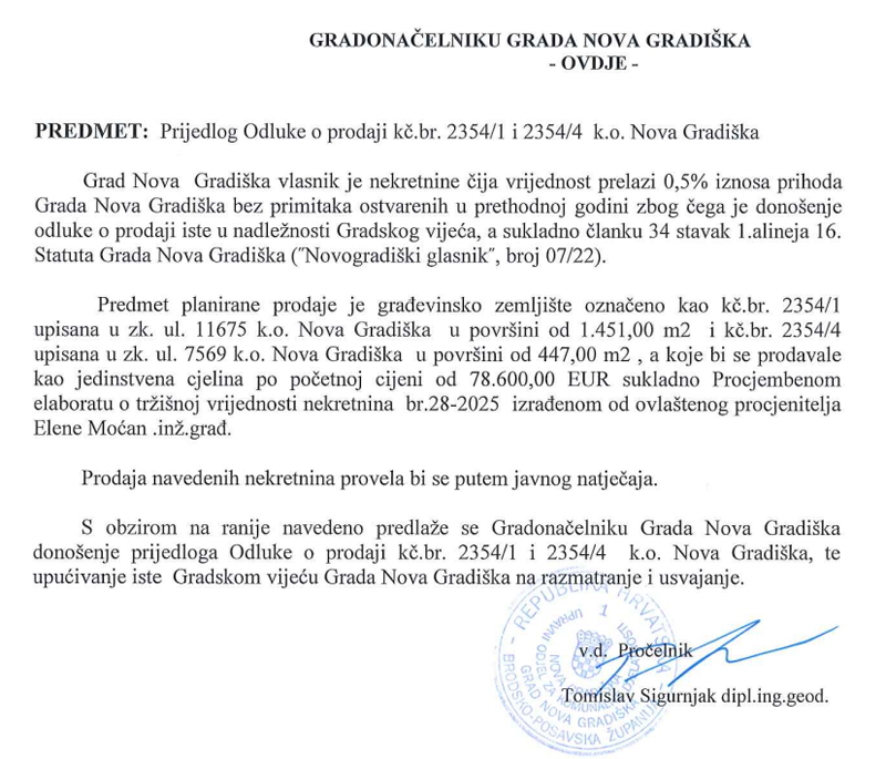 Naime, tema točke je prodaja čestica u centru grada kč.br. 2354/1 i 2354/4, odnosno dijela dječjeg igrališta, dijela parkinga i pješačke staze kvadratura 1451 m2 plus 447 m2 po početnoj cijeni od 78.600 eura.