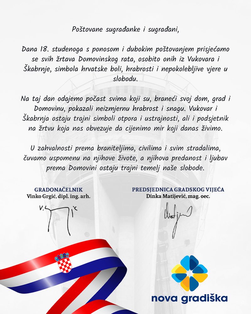 Naslovnica GRAD Domovinski rat 18. studenoga – Dan sijećanja na žrtve Domovinskog rata i Dan sijećanja... GRADDomovinski ratTOP NEWS 18. studenoga – Dan sijećanja na žrtve Domovinskog rata i Dan sijećanja na žrtvu Vukovara i Škabrnje Objavio Dejan Ivanković - 17/11/2025 143 0 FacebookTwitterPinterestWhatsApp Izvor: Grad Nova Gradiška