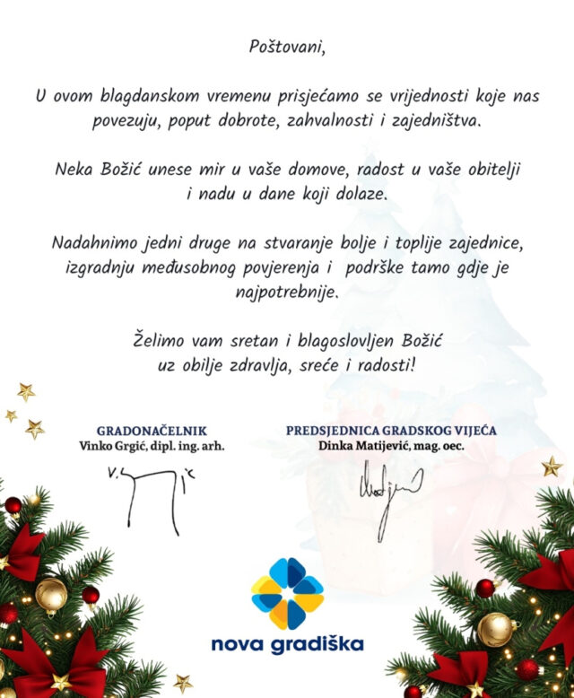 Naslovnica GRAD Božićna čestitka vodstva grada Nova Gradiška GRADObavijestiTOP NEWS Božićna čestitka vodstva grada Nova Gradiška Objavio Dejan Ivanković - 24/12/2025 114 0 FacebookTwitterPinterestWhatsApp