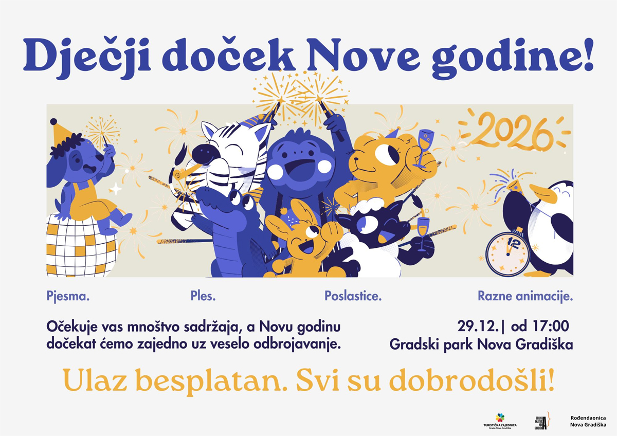 Gradska knjižnica Nova Gradiška u suorganizaciji s Turističkom zajednicom grada Nove Gradiške i Rođendaonicom Nova Gradiška poziva svu djecu i njihove obitelji na DJEČJI DOČEK NOVE GODINE koji će se održati u ponedjeljak, 29. prosinca u 17 sati u gradskom parku.