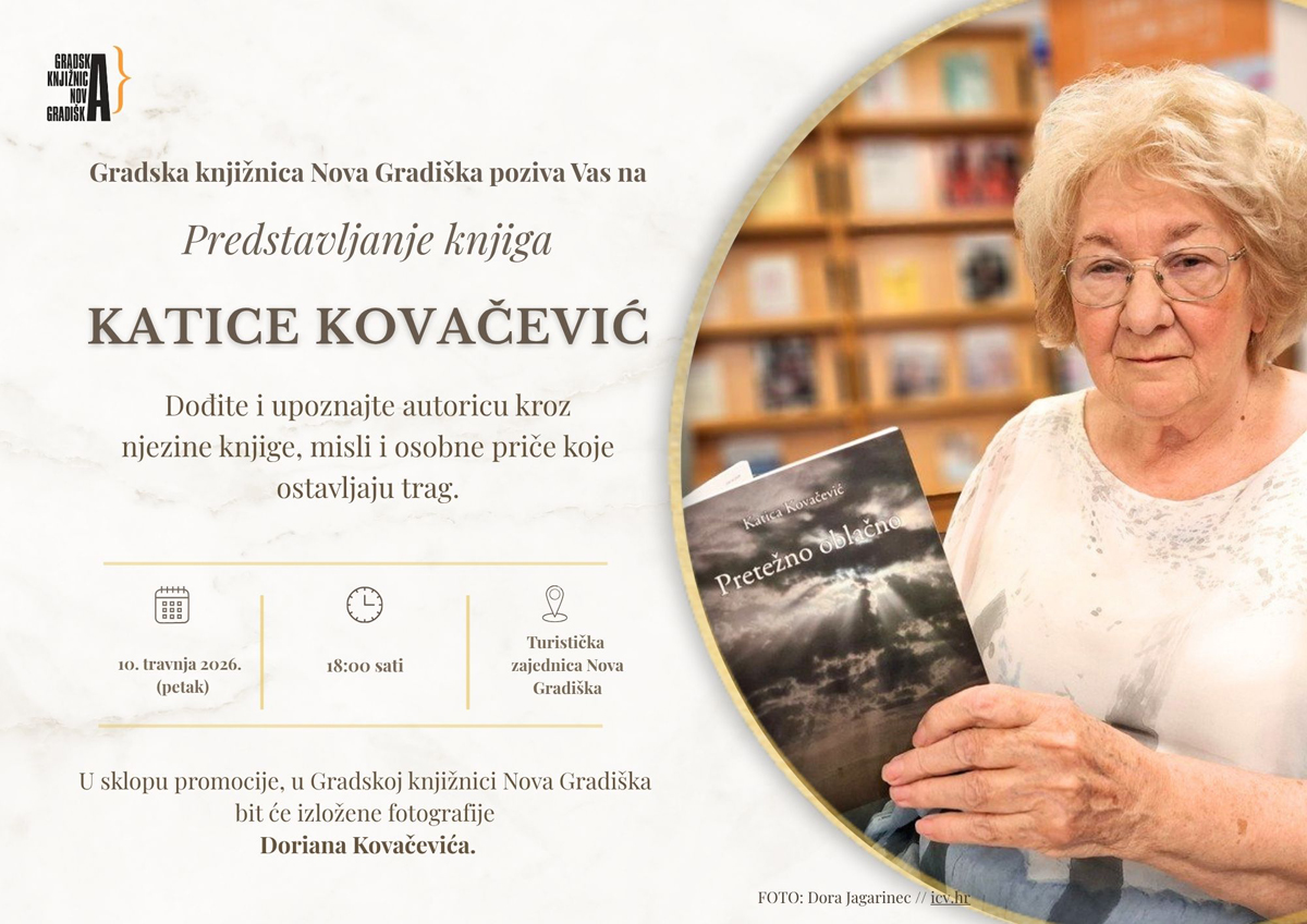 Gradska knjižnica Nova Gradiška poziva sve ljubitelje pisane riječi na predstavljanje knjiga autorice Katice Kovačević. Tom će prigodom biti predstavljena njezina djela: „Malčika”, „Alo, Kate”, „Miris kamilice”, „Pismo za Emu” i „Pretežno oblačno”.