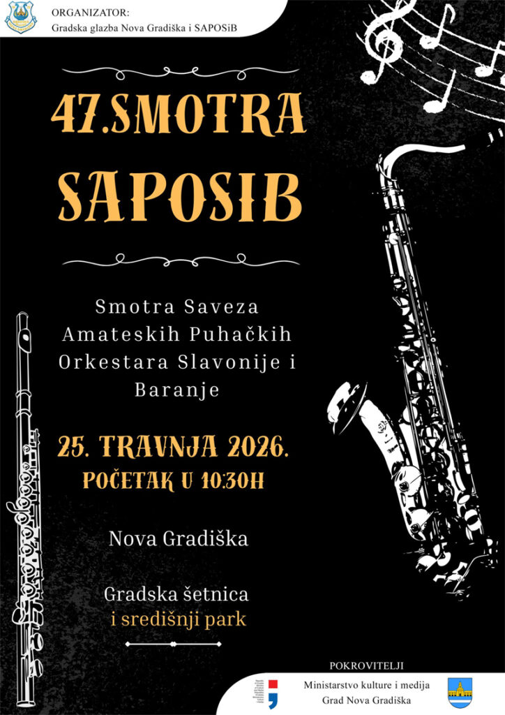 Gradska glazba Nova Gradiška s velikim zadovoljstvom najavljuje 47. Smotru Saveza amaterskih puhačkih orkestara Slavonije i Baranje (SAPOSIB), tradicionalno glazbeno događanje koje već desetljećima okuplja zaljubljenike u puhačku glazbu i njeguje bogatu kulturnu baštinu našega kraja.